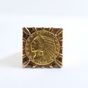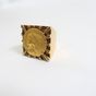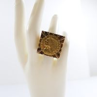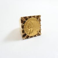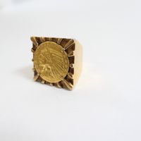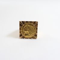 Importante chevalière en or 750 mil centrée d'une pièce US de 5 US dollars en or 900 mil (tête d'indien, 1908) (Dim chaton : 2,5 cm ; TDD : 57, déformation). 36,4 g.