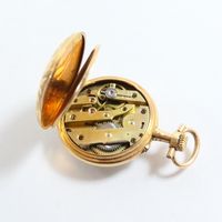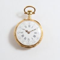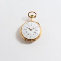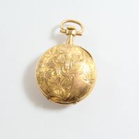Montre de col en or 750 mil, boîtier rond (Diam : 29 mm), cadran blanc à chiffres romain, dos guilloché à décor floral, mouvement mécanique. 18,8 g brut.