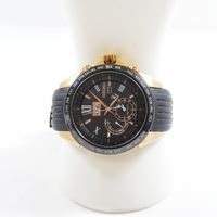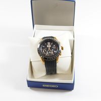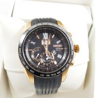 Montre d'homme en acier et céramique sur bracelet caoutchouc (Long réglable), chronographe à boîtier rond (Diam : 45 mm), cadran noir à chiffres romain avec fonction double fuseau, grande date, mise à l'heure automatique, lunette céramique, SEIKO "Astron GPS Solar grande date" mouvement quartz (Dans son écrin).