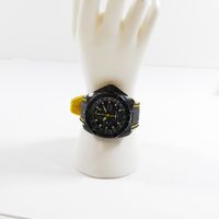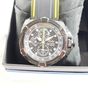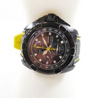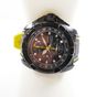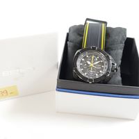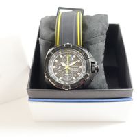 Montre d'homme en acier sur bracelet caoutchouc (Long : de 16,5 à 22 cm environ), boîtier rond (Diam : 48 mm environ), cadran noir à 3 compteurs secompteurs, guichet dateur à 4h et fonction alarme, SEIKO "Velatura Chronograph" mouvement quartz (dans son écrin).