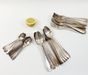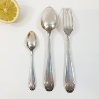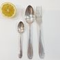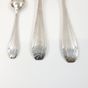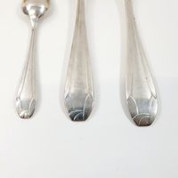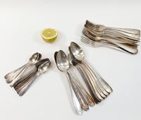 APOLLO, années 1940-1950 : Ménagère en métal argenté, spatule piriforme à filets et draperies asymétriques comprenant : - 12 grandes fourchettes, - 12 grandes cuillers, - 12 petites cuillers. Poinçon de la maison. Légère usure d'usage.
