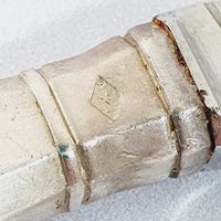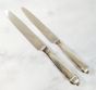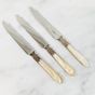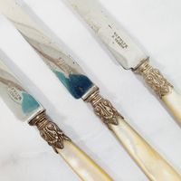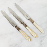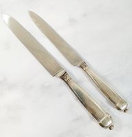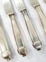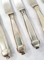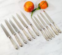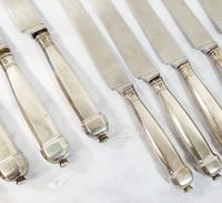 AUGER Frères (actif 1889-1900) : Suite 6 grands couteaux et 5 petits couteaux en argent fourré 950 mil. modèle à pans et culots boutons. Lames acier. Poinçon Minerve et poinçon de maître AF à l'étoile dans un carré. Poids brut : 861,9 g. Viroles à recoller. On y joint 3 petits couteaux manches en nacre, viroles en métal argenté et lames acier signées "BIFULER à Genève".