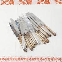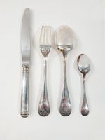 CHRISTOFLE, modèle MALMAISON, XXe siècle : Ménagère de 48 pièces en métal argenté, décor à frises de feuilles d'eau comprenant : - 12 grandes fourchettes, - 12 grandes cuillers, - 11 petites cuillers, - 12 grands couteaux avec lames inox, - 1 louche. Signés et poinçon de la maison post 1983. Dont 14 pièces sous blister.
