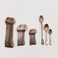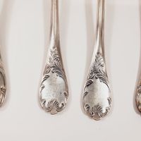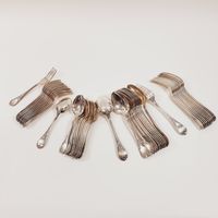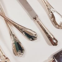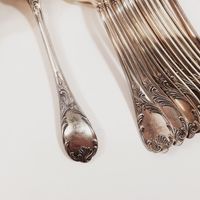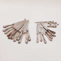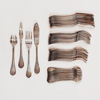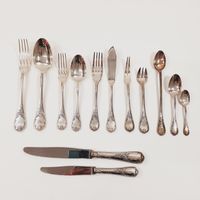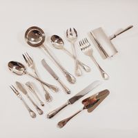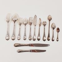 CHRISTOFLE, modèle MARLY, XXe siècle : Ménagère de 169 pièces en métal argenté à décor rocaille comprenant : - 12 grandes fourchettes, - 12 grandes cuillers, - 12 fourchettes à entremets, - 12 cuillers à entremets, - 12 fourchettes à poisson, - 12 couteaux à poisson, - 12 fourchettes à escargot, - 12 fourchettes à huîtres, - 12 grands couteaux, - 12 petits couteaux, - 12 cuillers à coupe de glace ou cocktail, - 12 petites cuillers, - 12 cuillers à moka, - 1 louche, - 1 couteau à pain, - 1 couvert à salade de 2 pièces, - 1 cuiller à ragoût, - 1 fourchette de service à poisson, - 1 pelle à tarte, - 1 fourchette de service à gâteau, - 1 couteau à fromage, - 1 tartineur à beurre, - 1 fourchette à saucisson ou viande froide, - 1 pince à sucre, - 1 ramasse-miette (manche à recoller), Poinçon de la maison.