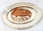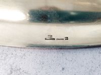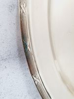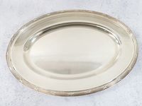 CHRISTOFLE, modèle RUBANS, XXe siècle : Grand plat ovale en métal argenté, fond uni et aile à filets rubanés. Poinçons de la maison pour 1935-1983. Dimensions : 35 x 50 cm. Légères rayures d'usage, petit choc à l'argenture sur l'aile.