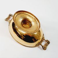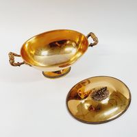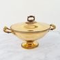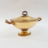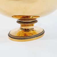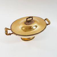 Eugène DELEBOIS (actif 1827-1842) : Soupière couverte ovale sur piédouche en vermeil 950 mil., les bords à frises de godrons, la prise annulaire et les anses ornés d'acanthes. Poinçon Minerve et poinçon de maître (ED avec un pied de Mercure). Hauteur : 24,5 cm. Longueur : 36,5 cm. Largeur : 20,5 cm. Poids : 1459,5 g.