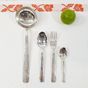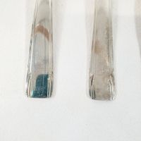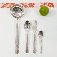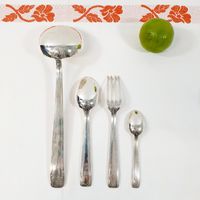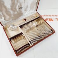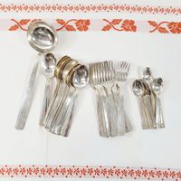 FRIDOR, Saint Ouen, années 1950 : Ménagère de 37 pièces en métal argenté à spatule triangulaire moulurée comprenant : - 12 grandes fourchettes, - 12 grandes cuillers, - 12 petites cuillers, - 1 louche. Poinçon de maitre. Légères rayures d'usage. Dans son écrin d'origine de fabriquant.