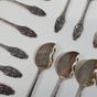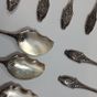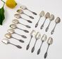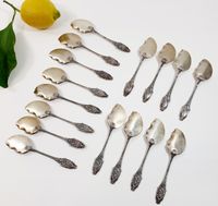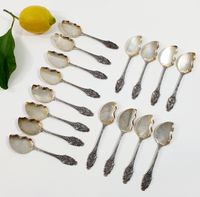 Gaston BARDIES (actif 1897-1914) : Suite de 16 cuillers à glace en argent et vermeil 950 mil., modèle de style guirlande à cannelures, fleurs et trophées, le cuilleron à bord mouvementé. Poinçon Minerve et poinçon de maître GB à la fleur de lys héraldique. Poids : 376 g. Usures au vermeil.