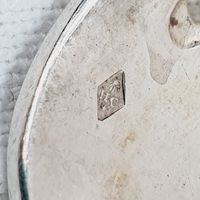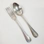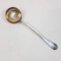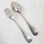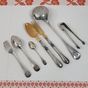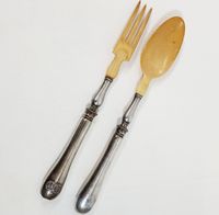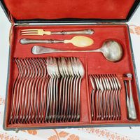HENRI CHENAILLIER (actif 1867-1884) : Ménagère de 39 pièces en argent 950 mil. modèle baguette comprenant : - 12 grandes fourchettes, - 12 grandes cuillers, - 11 petites cuillers, - 1 pince à sucre, - 1 louche, - 1 couvert à salade de 2 pièces (manches argent fourré et parties supérieures en corne), Poinçon Minerve et poinçon de maître HC au soleil levant et étoile. Chiffrés en relief en lettre gothiques. Poids net sans les couverts à salade : 2481,8 g. Poids total brut : 2631 g. Rayures d'usage. On y joint un écrin défraîchi.
