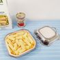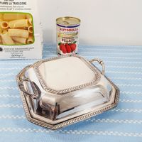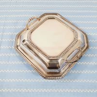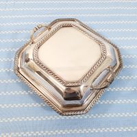 Légumier couvert anglais dit Entree dish en métal argenté : modèle carré à pans, décor de frises de godrons tors, couvercle à 2 anses pouvant formé un second plat de présentation. Travail anglais du XXe siècle. Aucun poinçon. Dimensions : 20 x 20 cm.