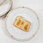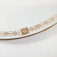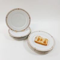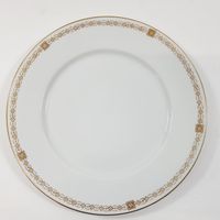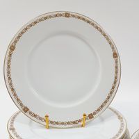 Manufacture RICHARD GINORI, Italie, XXe siècle : Suite de 9 grandes assiettes en porcelaine blanche et or à filet et frise géométrique perlée. Signées au dos, certaines numérotées. Diamètre : 24,5 cm.