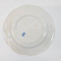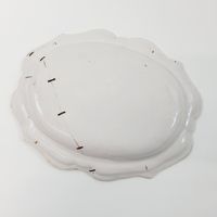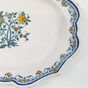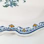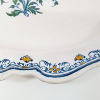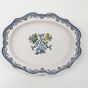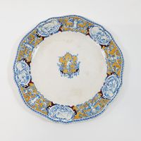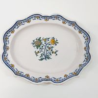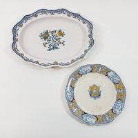MOUSTIERS, XVIIIe siècle : Grand plat chantourné en faïence à décor polychrome dit "à la grenade", l'aile ornée de filets et fleurettes. Non signé. Dimensions : 29 x 36,5 cm. Restauration agrafes, éclats, fêles, égrenures. On y joint une assiette chantournée en faïence de GIEN, XIXe siècle, à décor néo renaissance de grotesques dans les tons bleus et jaunes. Marque au dos. Diamètre : 24 cm. Usures d'usage.