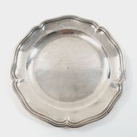 PARIS, 1763 : Plat modèle filets contours en argent 950 mil. Poinçon de charge et décharge pour Paris 1762-1768. Poinçon de la maison commune : Z pour 1763. Poinçon de maître illisible. Diamètres : 25,5 cm. Poids : 601,3 g. Armoiries partiellement effacées, rayures d'usage.
