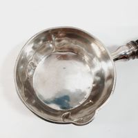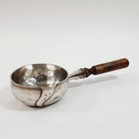 Paul CANAUX & Cie (actif 1888-1911) : Casserole à sauce en argent 950 mil. à fond uni avec manche en bois tourné amovible Poinçons Minerve et poinçons de maître (PC&Cie enclume). Diamètre : 9,6 cm. Poids net argent : 130 g. Poids total brut : 151,5 g. Bois fendu, chocs et déformations.