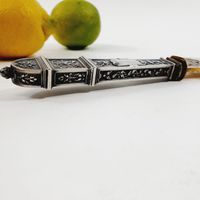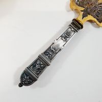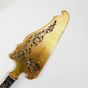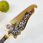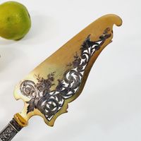 Pelle à tarte, style guirlande, vers 1900 : en argent fourré 950 mil. à décor de cartouches, vases fleuris et guirlandes de feuillage. La pelle en métal doré ajouré à rinceaux feuillagés et fleuris. Poinçon Minerve et poinçon de maître illisible. Longueur : 25 cm, Poids brut : 111,3 g. Manche à recoller.
