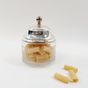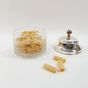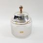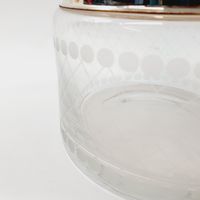Pot à biscuits (ou biscotti), Italie, XXe siècle : de forme ronde en cristal transparent à décor blanc satiné mat de pastilles et croisillons, le couvercle mouluré à prise bouton en métal argenté. Non poinçonné, étiquettes en italien indiquant les matériaux. Hauteur : 22 cm. Diamètre : 17 cm. Oxydations.