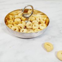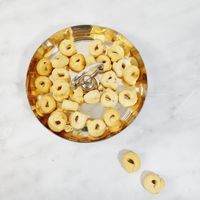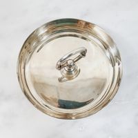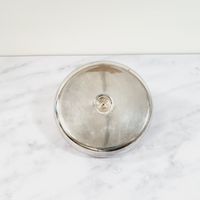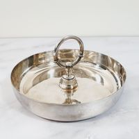 Présentoir de service à prise annulaire centrale en métal argenté : modèle uni, travail probablement anglais. Diamètre : 18 cm. Hauteur : 9 cm. Légère déformation.