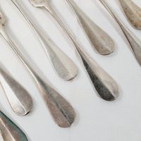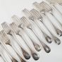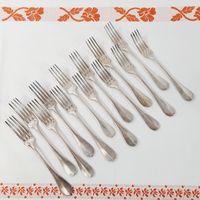 PUIFORCAT, modèle BAGUETTE, début XXe siècle : Suite de 13 grandes fourchettes en argent 950 mil à spatules ornées d'un médaillon ceinturé chiffré. Minerve et poinçon de maître EP au canif. Poids : 1042,5 g Légères rayures d'usage.