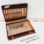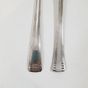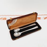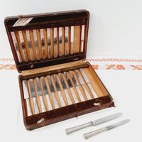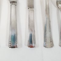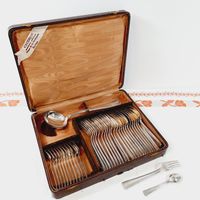 ROUX-MARQUIAND, modèle ART DECO, années 1930-1940 : Ménagère de 63 pièces en métal argenté, modèle à spatule triangulaire, filets et gradins comprenant : - 12 grandes fourchettes, - 12 grandes cuillers, - 12 petites cuillers, - 12 grands couteaux (lames inox), - 12 petits couteaux (lames inox), - 1 louche, - 1 couvert à salade de pièces. Poinçon de la maison. Légère usure d'usage. On y joint 3 écrins défraichis.