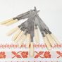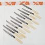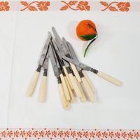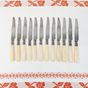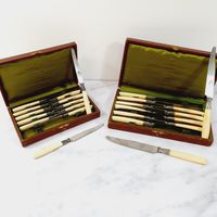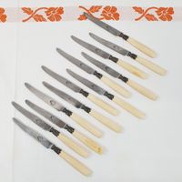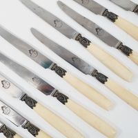 Suite de 24 couteaux, style guirlande, vers 1900 : à manches tonneau en corne blonde, les viroles en métal argenté ornées de draperies et acanthes, les lames en acier comprenant : - 12 grands couteaux (longueur : 26 cm) - 12 petits couteaux (longueur : 21,2 cm) Aucun poinçon. Manches en corne avec quelques petites fentes, petites rayures. On y joint 2 écrins légèrement défraichis.