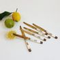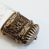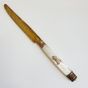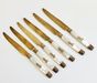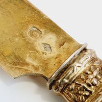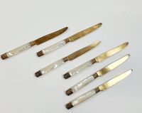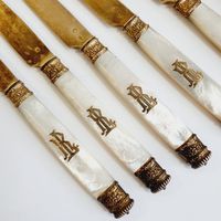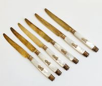 Suite de 6 petits couteaux à fruits, vers 1900 : en vermeil 950 mil. (lame, culot, virole) et manches en nacre. Modèle de style Louis XVI à filets rubanés et guirlandes de roses. Chiffrés RL. Poinçon Minerve et poinçon de maître ( P.F). Poids brut : 195,1 g.