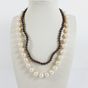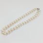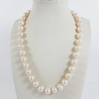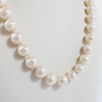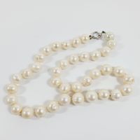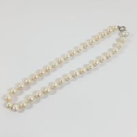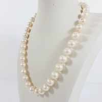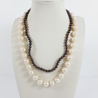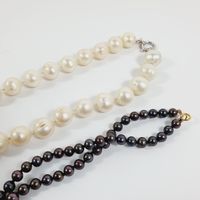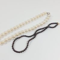 2 colliers d'un rang de perles de culture : - 1 collier de perles de culture d'eau douce cerclées (diamètre : 11 mm environ), fermoir en or rhodié 750 mil. (Longueur : 44,5 cm environ). 67,5 g. brut. - 1 collier de perles de culture grises (diamètre : 5,2 mm environ), fermoir en métal. (Longueur : 40 cm environ)