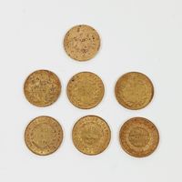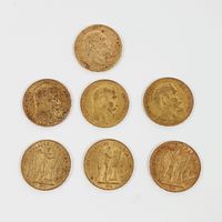 7 pièces de monnaie : en or 900 mil., dont 6 pièces de 20 FRF (datées 1854, 1855, 1856, 2x 1876 et 1893), et 1 pièce de 20 Francs Belge (datée 1874). 45 g.