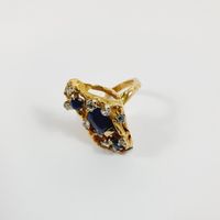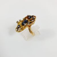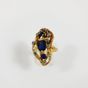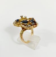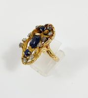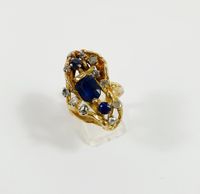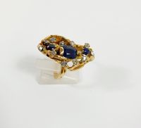 Bague moderniste : en or 750 mil. texturé, centrée d'un saphir taille ovale de 1 carat environ, et ponctuée de 2 saphirs ronds et roses en serti griffes (TDD : 53) (1 pierre accidentée, soudure). 14,2 g. brut.