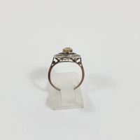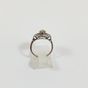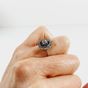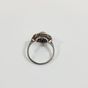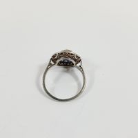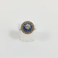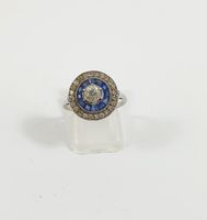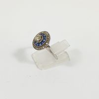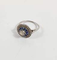 Bague : en platine 950 mil. à chaton rond centré d’un diamant TA de 0,20 carat en serti griffes dans un double entourage de saphirs calibrés et diamants 16/16. (Largeur : 1,4 cm environ) (TDD : 50). 3,5 g. brut.