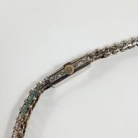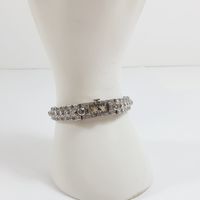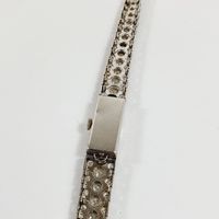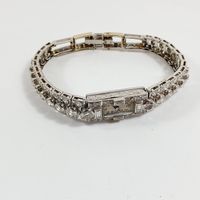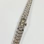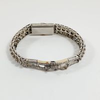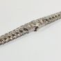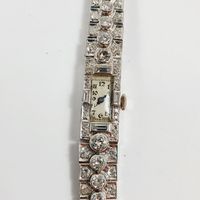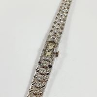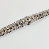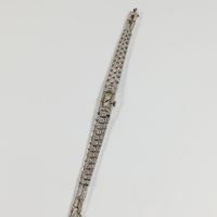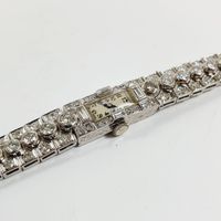 Bracelet-montre de dame : boîtier rectangulaire rehaussé de diamants brillantés et baguettes en platine 950 mil. (Dimensions : 21 x 10 mm environ), cadran crème à chiffres arabes, mouvement mécanique défectueux, bracelet à maillons articulés serti de diamants brillantés en or gris 750 mil. et platine 950 mil. (Long : 17 cm environ), fermoir cliquet et huit de sécurité. 29,7 g brut.
