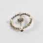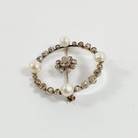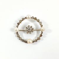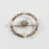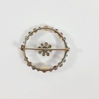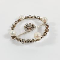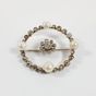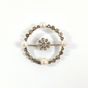 Broche ronde : en or gris 750 mil. et cristal de roche, centrée d'une fleurette sertie de diamants TA, dans un entourage de perles de culture, diamants TA et roses. (Diamètre : 3,6 cm environ) (Salissures). 11,5 g brut.