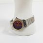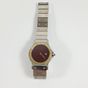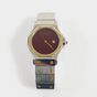 CARTIER, Santos Octogonale : Bracelet-montre de dame en acier et or 750 mil., lunette à décor de vis, cadran bordeaux muet (diamètre : 24 mm), remontoir serti d'une pierre imitation rouge, mouvement automatique, bracelet articulé en acier et or 750 mil. à décor de vis à boucle déployante signée. (Longueur : 16 mm environ). 49,2 g. brut. (Exemptée art L833-2 du CGI). 69,4 g. brut. Avec livret et écrin.