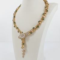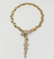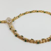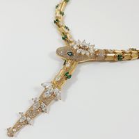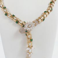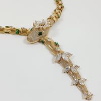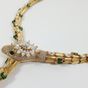 Collier Serpent : semi-rigide en or jaune 750 mil., le corps formé d'écailles et la tête rehaussée d'une fleur, sertis de pierres imitation blanches et vertes, fermoir cliquet. (Longueur : 43 cm environ). 91,9 g. brut. Assorti au lot précédent.