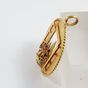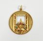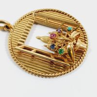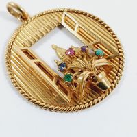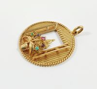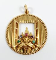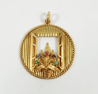 Pendentif : rond ajouré en or 750 mil. rainuré à décor d'une fenêtre ouverte sur trois coupoles, un bouquet rehaussé en serti griffes d'émeraude, saphir, rubis, améthyste et pierre décorative au premier plan. (Diamètre : 3,5 cm environ). 12,6 g. brut.