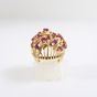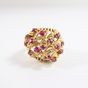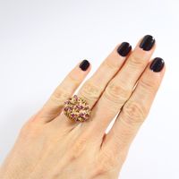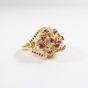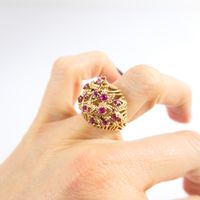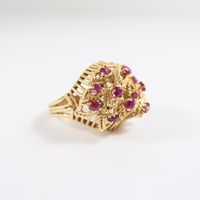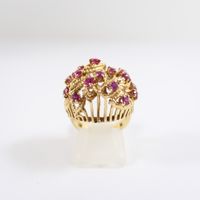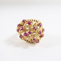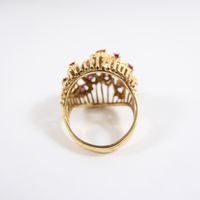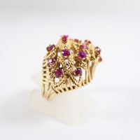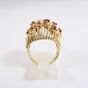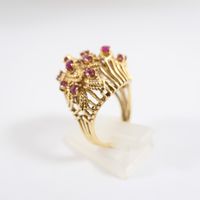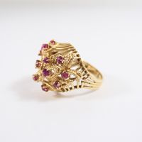 Bague : en or 585 mil. à décor feuillagé composé de fils d'or, ponctuée de rubis et de pierres imitation rouge (TDD : 51) (largeur : 18,5 mm environ) (petits éclats). 6,8 g. brut
