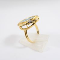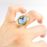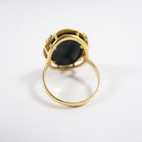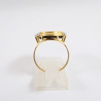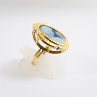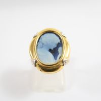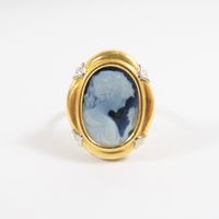 Bague : en deux ors 750 mil. ornée d'un camée agate à profil féminin, travail français (TDD : 54) (dimensions : 20,6 x 16,7 mm environ). 4,5 g. brut