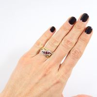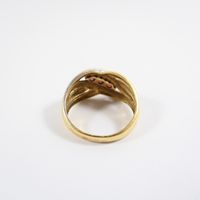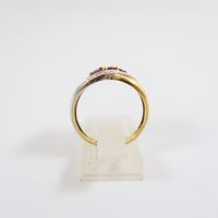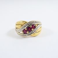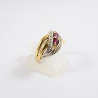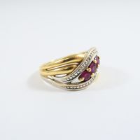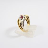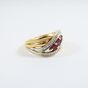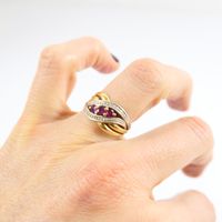 Bague "entrelacs" : en deux ors 750 mil. sertie de rubis ronds et de diamants taille 8/8 (TDD : 54) (largeur : 11 mm environ). 3,9 g. brut