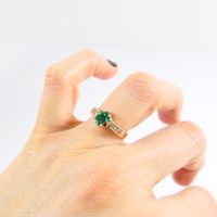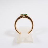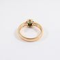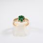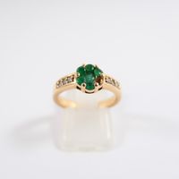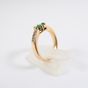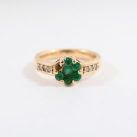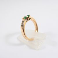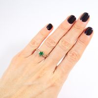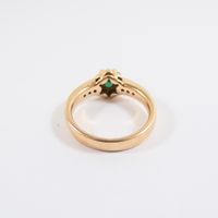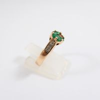 Bague fleur : en or rose 585 mil. sertie d'émeraudes rondes et de diamants taille brillant (TDD : 50,5) (largeur : 7,1 mm environ) (manque une pierre, éclats, chiffrée). 4,5 g. brut