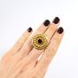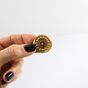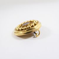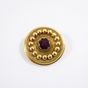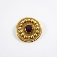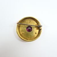 Broche ronde : en or 750 mil. centrée d'une rhodolite dans un entourage à décor perlé, épingle en métal (diamètre : 2,8 cm environ) (chocs, déformations). 4,2 g. brut