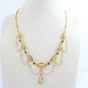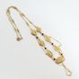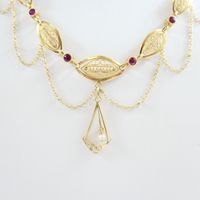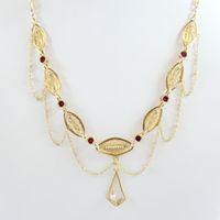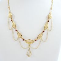 Collier draperie : en or 750 mil. à maillons filigranés centrés de perles semence, alternés de pierres imitation rouges et retenant de fines chaînes et un élément central (longueur : 41,5 cm environ) (largeurs maillons : de 3,2 à 9,5 mm environ) (légères déformations). 7,5 g. brut