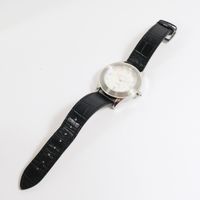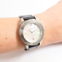 MAUBOUSSIN : montre sur bracelet modèle "Lifetime mon Amour". Boîtier rond en acier (Diam.: 36 mm environ). Cadran nacre à chiffres romain et index. Guichet dateur à 6 h. Fond squelette. Mouvement mécanique à remontage automatique. Signé et numéroté. Sur bracelet en cuir à boucle ardillon en métal. (Tour de poignet de 16 à 21 cm environ).