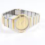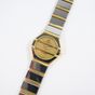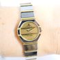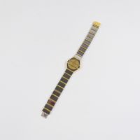 BAUME & MERCIER, "Avant - Garde" : bracelet - montre en acier noirci et or 750 mil., boîtier circulaire à pans coupés, cadran muet à fond doré traversé de deux godrons. Bracelet à maillons articulés alternant plaque d'acier et godrons en or, fermoir cliquet. (Diamètre boîtier : 21mm - Tour de poignet : 16cm environ). Mouvement à quartz. Travail des années 1980. Poids brut : 61g.