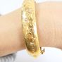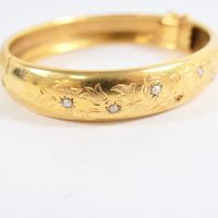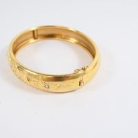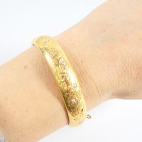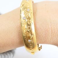 Bracelet jonc ouvrant : en or jaune 750 mil., ciselé à décor d'une frise de rinceaux fleuris, rehaussé de petites semences de perle. (Manque une perle). (Diam.: 16,5cm). Fermoir cliquet et huit de sécurité. Poids brut : 20,6g