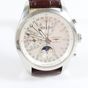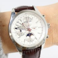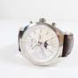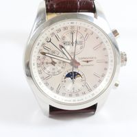 LONGINES, "Conquest Classic" chronographe : Montre bracelet d'homme en acier, boîtier rond (diamètre : 41 mm environ), le cadran à fond blanc rainuré, index fluorescent, sous compteur pour les secondes, phase de lune à 6H et calendrier à 12h. (Diam. : 40 mm environ). Mouvement mécanique à remontage automatique, sur bracelet cuir marron embossé à boucle ardillon (rapporté et usé). (Longueur : 2,5 cm environ - Tour de poignet : 17cm).