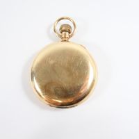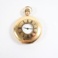Montre de poche demie - savonnette : en or 585 mil., cadran émaillé à fond blanc (petits chocs, rayures, traces d'oxydation), chiffres romains pour les heures. Aiguille en acier bleui (oxydation), sous compteur à 6h. Mouvement mécanique avec échappement à ancre. Travail américain. poids brut : 105,8g