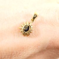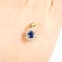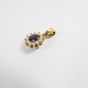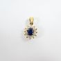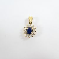 Pendentif marguerite : en or 375 mil., centré d'un saphir taille ovale facetté serti griffe dans un entourage de diamants taille brillant. (1,7cm x 0,7cm environ). Poids brut : 1,4g.