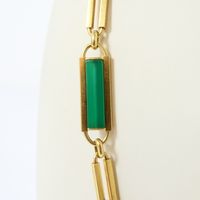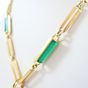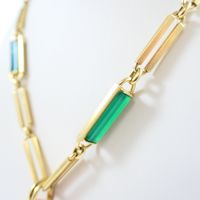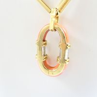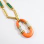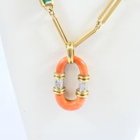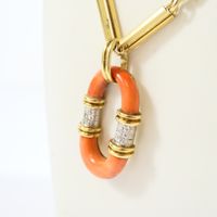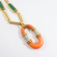 Sautoir : 2 ors 750 mil., à mailles rectangulaires ajourées, certaines ornées de chrysoprase, retenant un pendentif ovale ajourée orné de corail (fissuré, traces de colle) (dimensions : 4,3cm x 2,5cm environ) et ponctué de diamants taille 8/8 (Longueur : 79 cm environ). Travail italien des années 1970. Poids brut : 91,9g