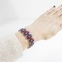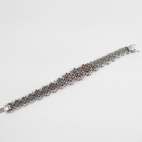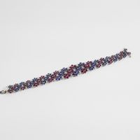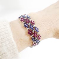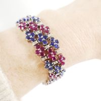 Bracelet ruban : en or gris 750 mil. formant une résille de fleurettes sertie de saphirs et de rubis ronds, alternées de diamants taille baguette. Le fermoir serti de diamants taille brillant, avec double système de sécurité (longueur : 17,8 cm ; largeur max. : 1,8 cm) (fermoir à revoir). 37,1 g. brut.