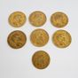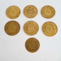 Lot de 7 pièces de monnaie en or 900 mil. : 6 x 20 FRF et 1 x 10 FRF (datées : 1852, 1854, 1858, 1859, 1864, 1866 et 1863). 41,8 g.