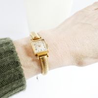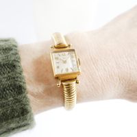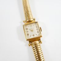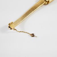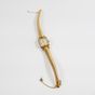 LUXE : Bracelet-montre de dame en or 750 mil., petit boîtier carré (16,5 x 16,5 mm), cadran champagne à index et chiffres arabes dorés, mouvement mécanique, sur bracelet en or 750 mil. à maillons tubogaz avec huit et chaînette de sécurité (longueur : 16,5 cm environ) (chaînette cassée, déformations, verre rayé). 26,6 g. brut.
